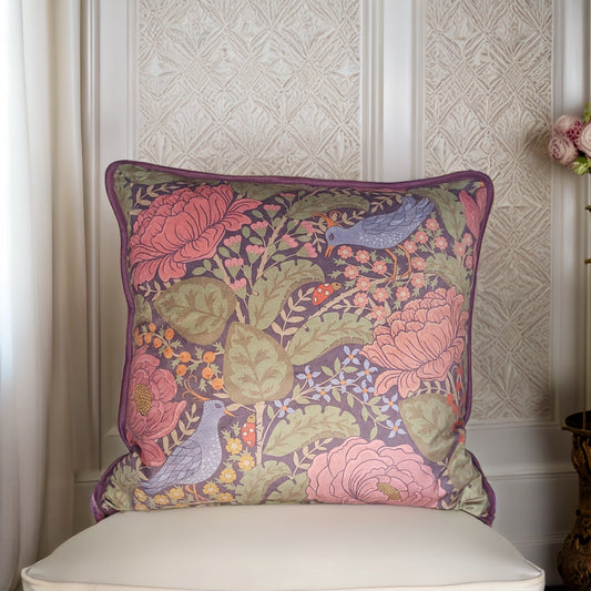 Velvet Cushion Cover – Peony & Birds Artwork | Luxury Decorative Cushion (45x45cm)
