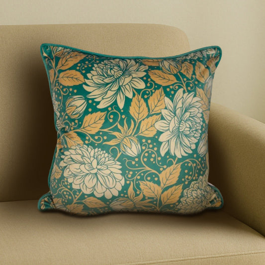 Designer Velvet Cushion Cover – Teal Dahlia Artwork | Luxury Statement Cushion (45x45cm)