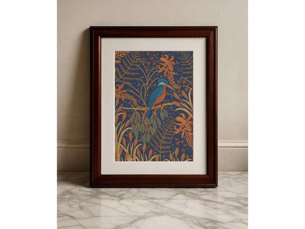 Elevate your space with the timeless elegance of our Kingfisher art print. Inspired by the grace and beauty of the kingfisher bird, this stunning piece captures the essence of nature’s splendor. A rich palette of deep navy, blue, creamy tones, and hints of gold creates a harmonious composition, bringing a touch of regal charm and the enduring beauty of the kingfisher—an emblem of grace in the natural world.